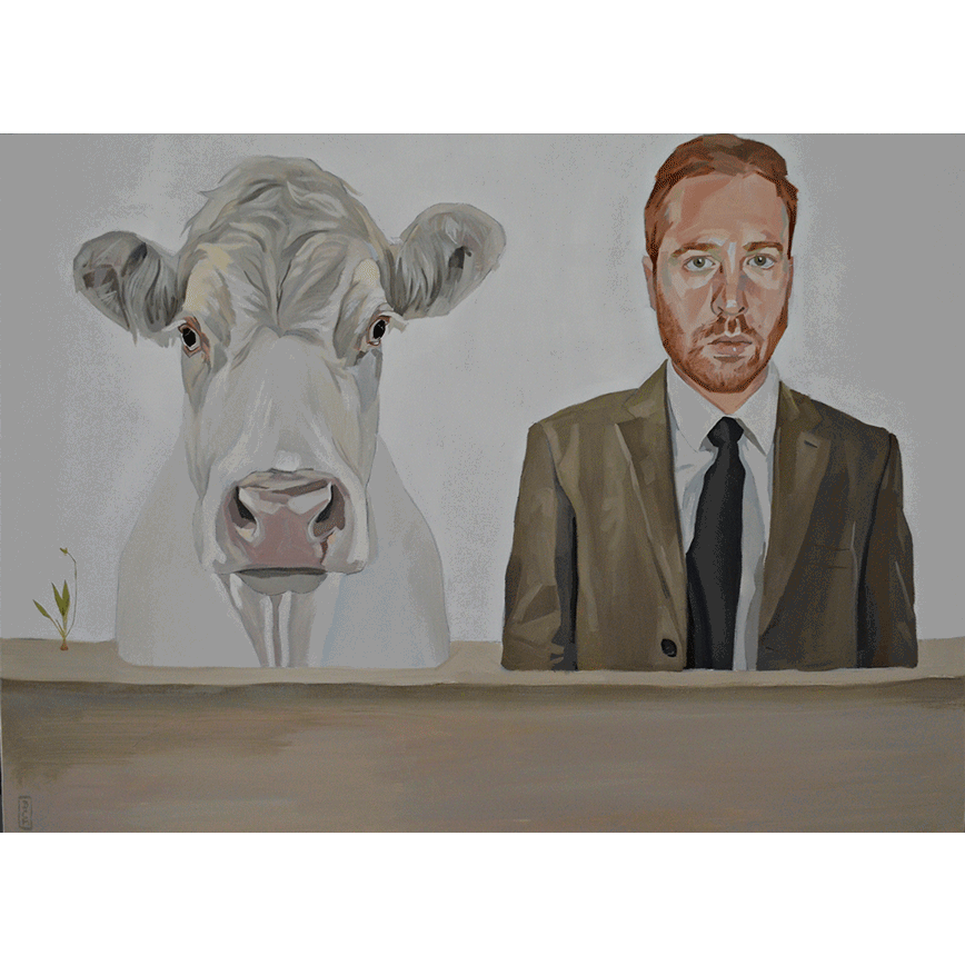 La obra de Diego Cerero Autorretrato con vaca sugiere de entrada un diálogo entre lo humano y lo animal, lo racional y lo instintivo, lo urbano y lo montaraz. El hecho de que este retrato esté planteado como una doble figura frontal, con la vaca y el artista en el mismo plano, presenta la idea de una aparente equidad etológica, casi una especie de espejo de almas entre dos seres que se observan sin jerarquía, compartiendo el mismo silencio en complicidad. Ambos miran al espectador con la misma gravedad. El traje del hombre frente al cuerpo desnudo del animal señala la distancia cultural, lo social frente a lo biológico. Sin embargo, el tono sereno y la luz neutra eliminan el dramatismo; no hay conflicto, sino reconciliación. Podría interpretarse también como una alegoría del alma dividida, donde la vaca representa la parte terrenal, tranquila, paciente, y el hombre la parte reflexiva o autoconsciente. El pequeño brote verde al lado izquierdo introduce un tercer elemento y que podría ser la vida que continúa, la naturaleza que persiste más allá de la existencia de los individuos, al margen de toda humanidad y las almas brutas que le acompañan. En conjunto, parece una meditación contemporánea sobre lo animal en el hombre y lo humano en el animal, una especie de reflexión filosófica sobre el alma de los brutos, o para decirlo en términos que aparenten confundir menos y parezcan más cercanos a los lectores de hoy, del alma de los animales. Es decir, que algo tan aparentemente metafísico como el Alma está haciendo referencia en realidad a la conducta animal y humana, tan similares en sus aspectos genéricos como ha sabido ver la Etología a raíz de la teoría de la evolución, especialmente desde que Darwin escribió su famoso escrito La expresión de las emociones en los animales y en el hombre (1871). Esta sería la problemática del Alma de los Brutos que versa sobre las relaciones histórico-filosóficas entre hombres y animales.