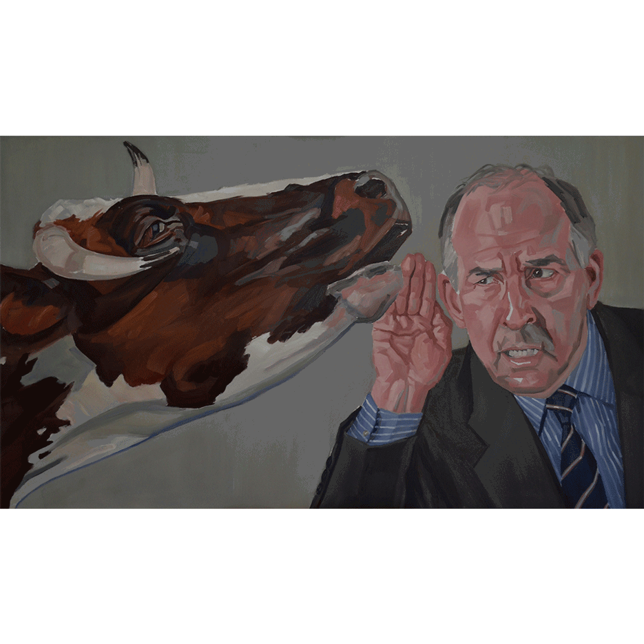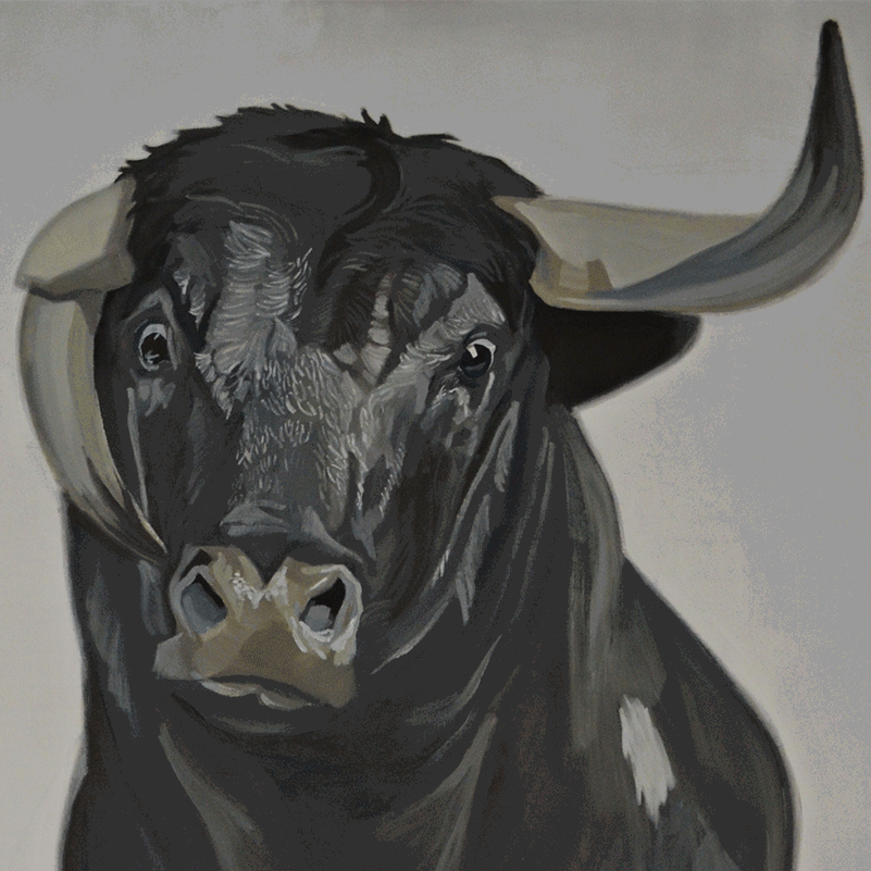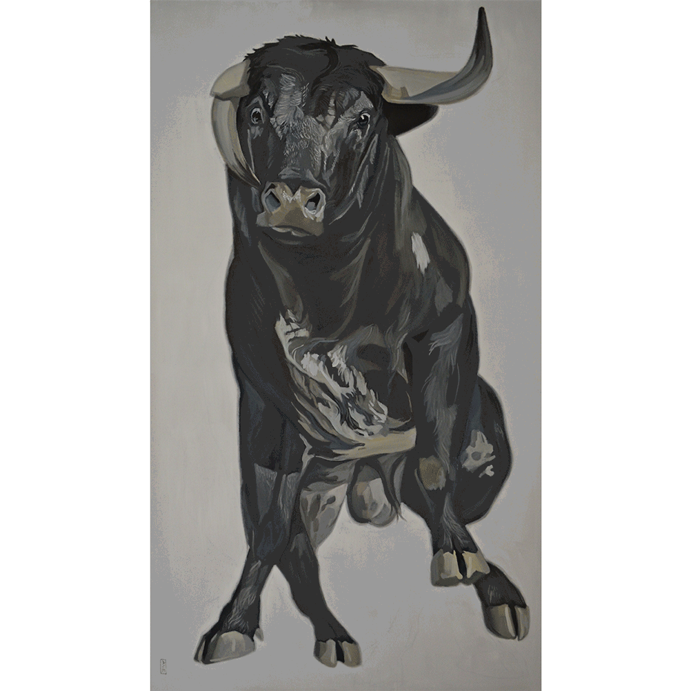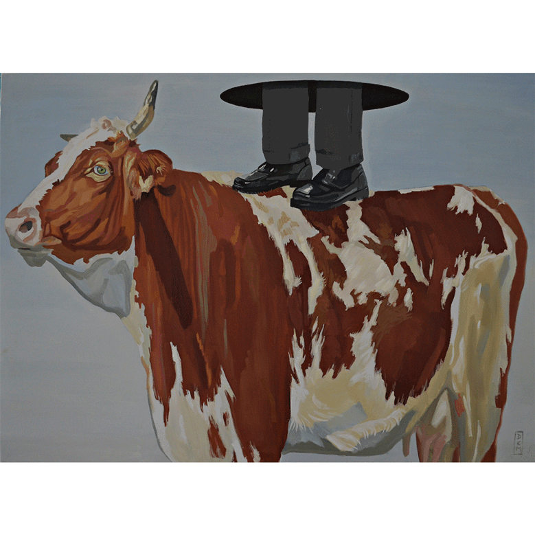 El mundo del heterónimo vaca –toro, y su conexión con el hombre, es uno de los temas más recurrentes en la producción de este joven onubense. No es casualidad que Diego viva en el campo, interactuando con los animales, de ahí la carencia de agresividad en sus bóvidos y unos comportamientos antropomórficos que asombran y seducen. Óleos sobre lienzo de gran tamaño ejecutados con ágil pincelada y abundante materia pictórica. Algunas pequeñas obras en óleo sobre papel abundan en la atmósfera surreal que flota en esta exposición.