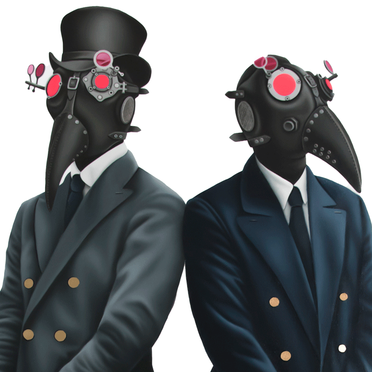 La presente selección de cuadros de Xevi Vilaró, puede que les provoque de inmediato una sensación dispersa de estar recibiendo sintéticos mensajes agónicos de máscaras inquietantes de cuero negro, artefactos visuales, voces ocultas o complementos impropios para trajes de etiqueta. Rápidamente verán que encajan perfectamente a la medida de unos cuerpos divididos que posan con indolente indiferencia, al mismo tiempo que delatan, intencionalmente, un contrapunto de ideas y materiales que sugieren al mismo tiempo armonía y subversión.